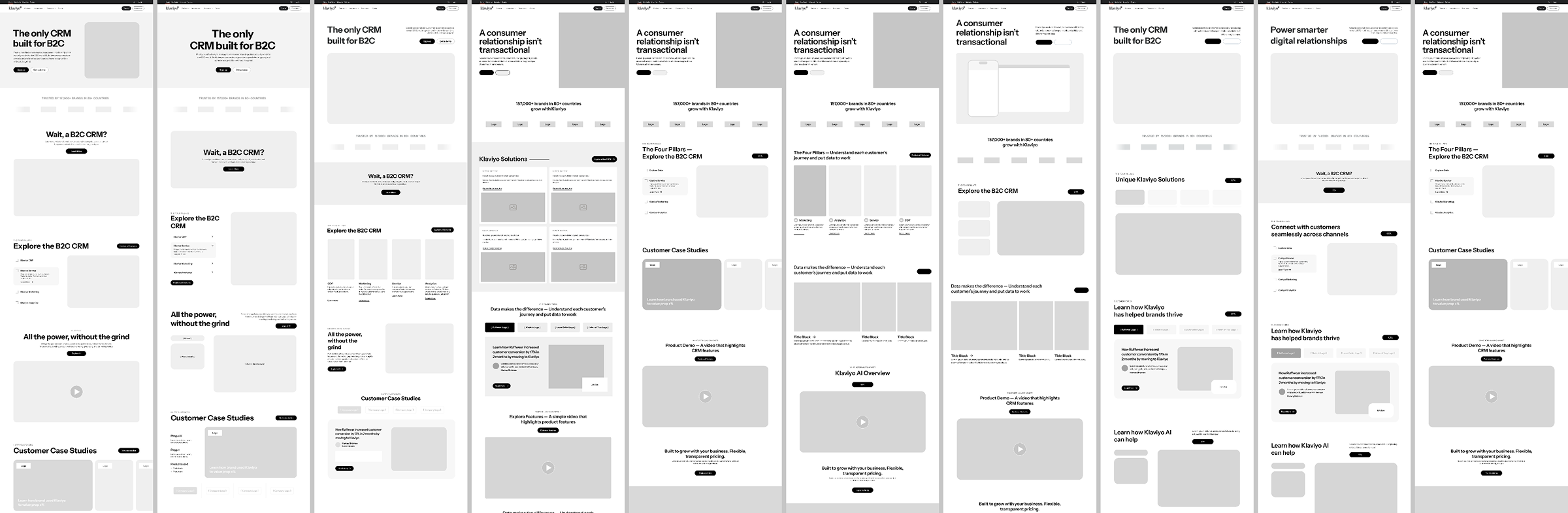 In parallel to the system work, I led design execution for the “B2C for CRM” campaign—collaborating across marketing, design, and development teams to translate the evolving brand direction into a responsive, high-impact web experience. We moved quickly from early wireframes to polished mockups and animations, referencing the design system wherever possible to reduce friction and technical debt.
