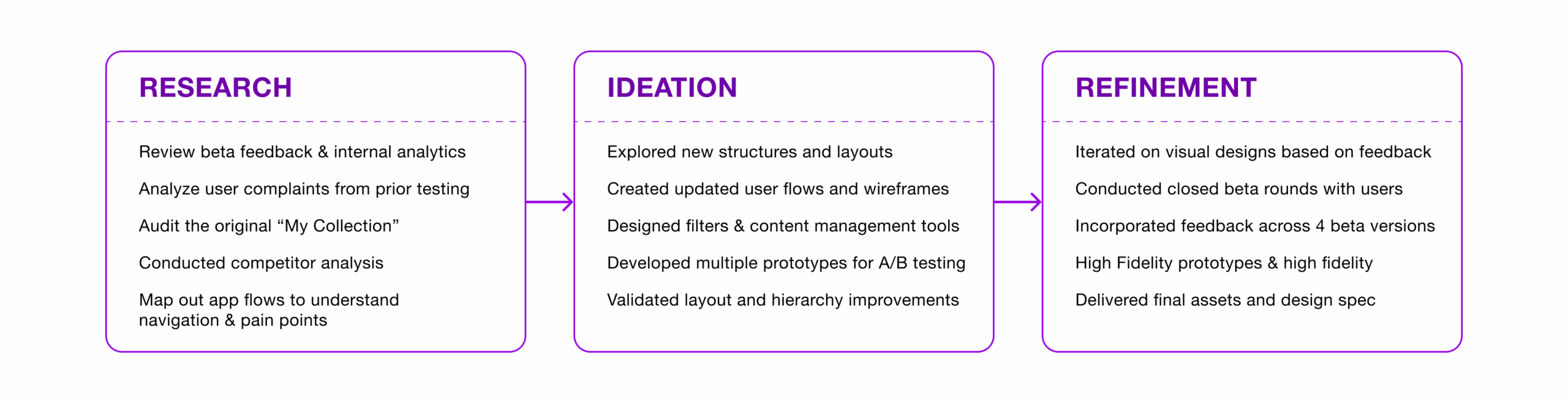These findings signaled a clear need to revisit the core structure and purpose of “My Collection” — not just to modernize it, but to make it feel essential.